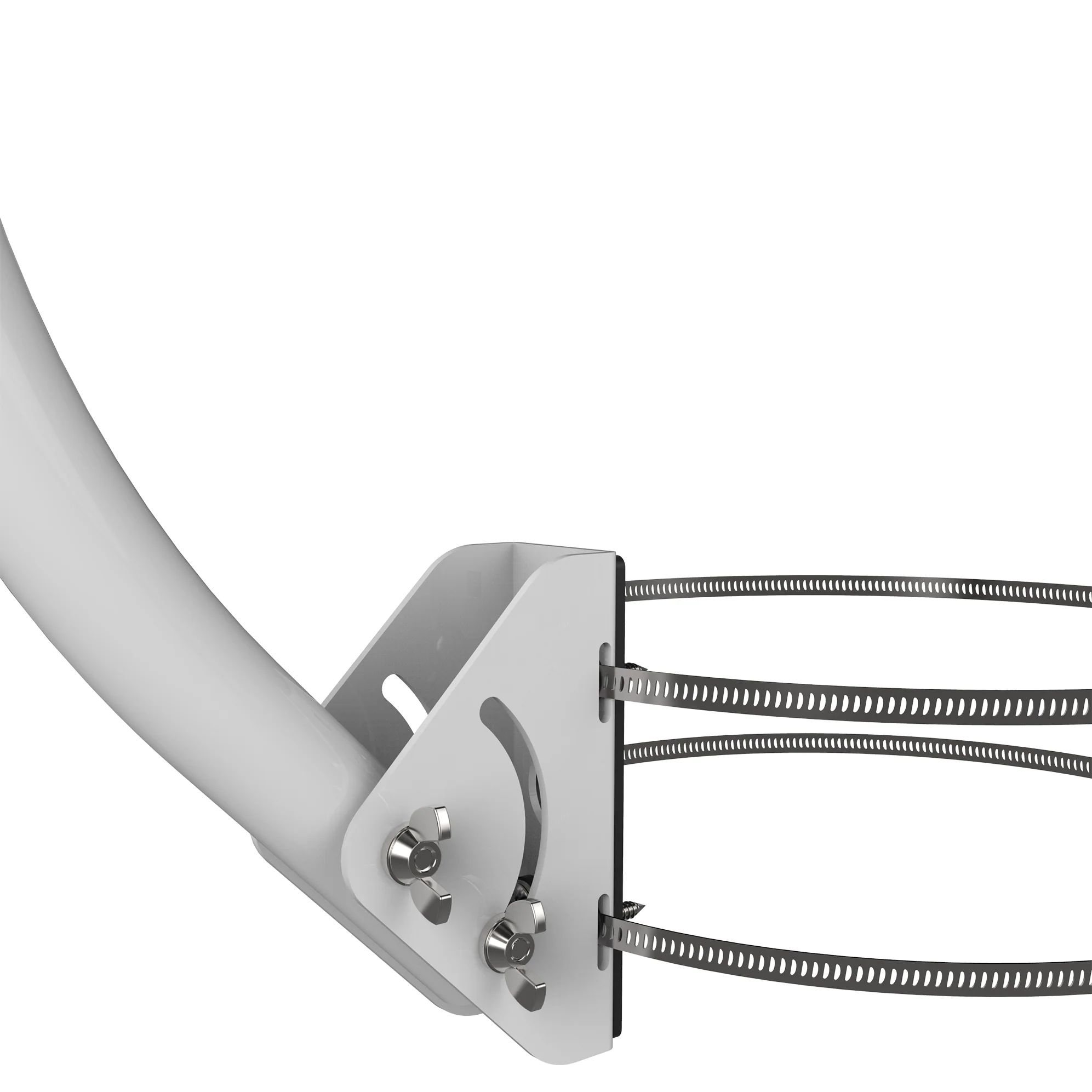 Two mast configurations are possible. Attaching the short end of the pole in the bracket will maximize installation height while attaching the long end in the bracket instead will provide greater distance from the mounting surface.